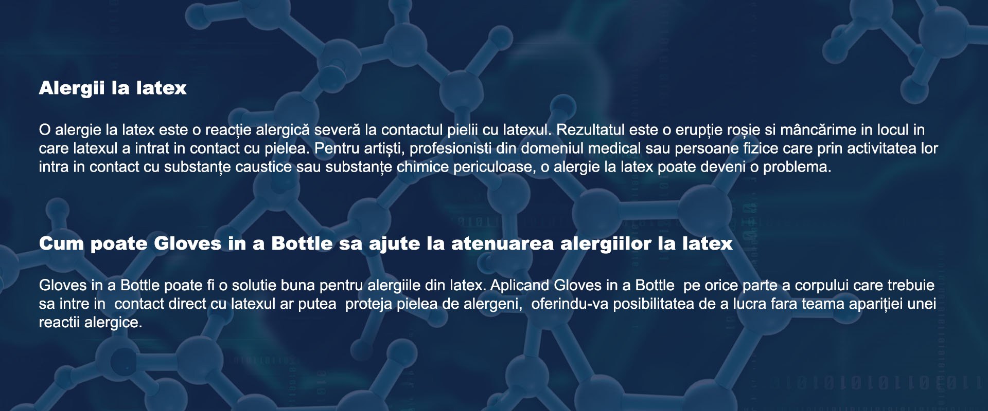 Am avut noroc de hair-stilistul meu care este si farmacist. El are o reacţie alergică la mănuşile de latex (dermatită de contact) şi nu poate purta niciun alt tip de mănuşi pentru că i se prind de păr când face părul permanent cuiva. Vopsitul părului este altă problemă. A spus că folosind loţiunea “Gloves In a Bottle” a putut evita mănuşile şi coafează şi vopseşte mai uşor şi mai repede, evitând efectele nocive ale chimicalelor. Îi este bună şi pentru job-ul de farmacist, pentru că se spală constant pe mâini deoarece oamenii bolnavi strănută şi tuşesc pe reţetele pe care apoi le dau farmaciştilor. “Gloves In a Bottle” le permite să se spele pe mâini des, fără să li se usuce mâinile de la săpun.